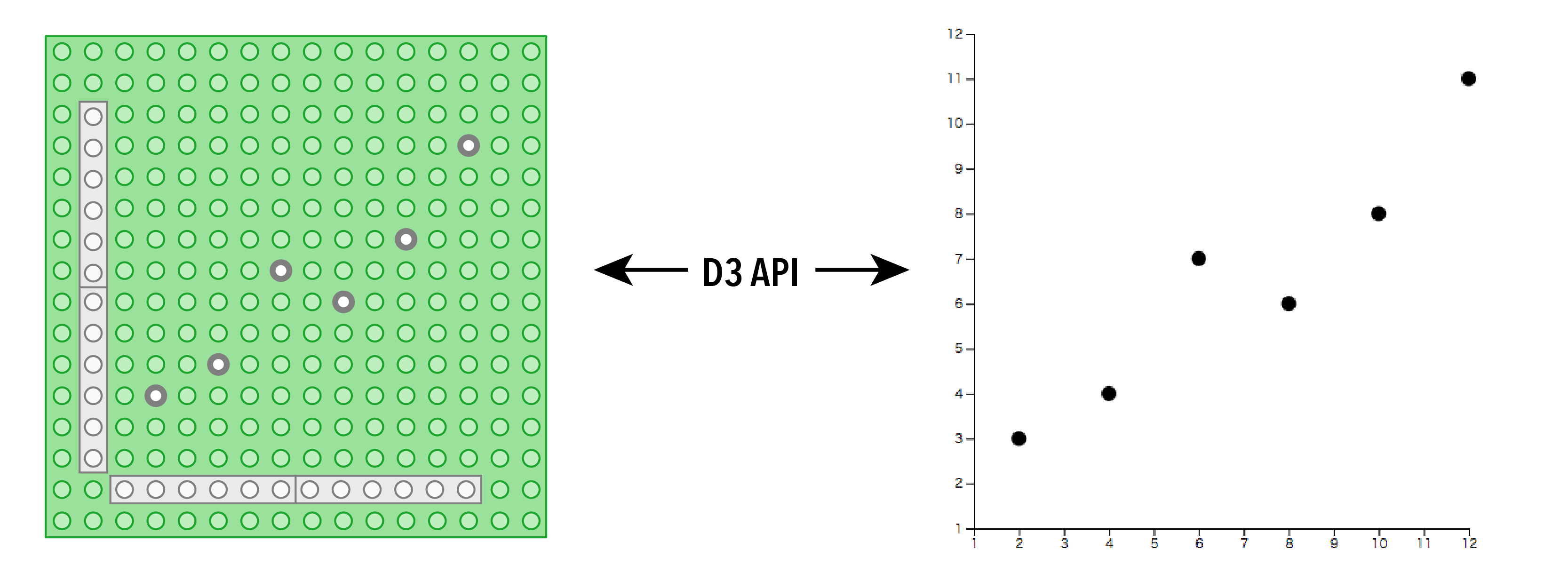 Recall earlier that we said D3 was the "physical API" operating between our LEGO blocks and the SVG canvas. When we use D3 in web pages, it functions as an API that manipulates the DOM. Since we've now made the claim that our LEGO space is actually just an abstraction of the DOM, our metaphor has come full circle.