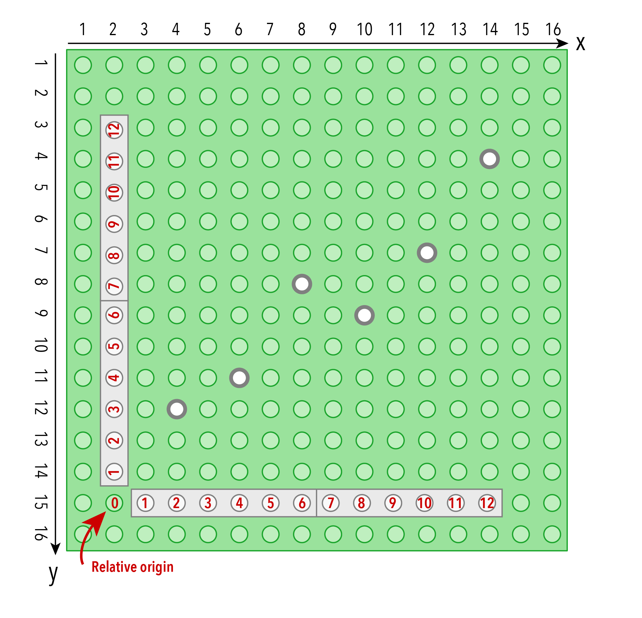You might notice something slightly odd going on with our data, however. Recall that in our LEGO commands, all operations are dispatched from an absolute origin at the lower left corner of the baseplate. In our SVG canvas, the absolute origin is now in the top left, but we also have a new relative origin at the corner created by the intersection of our "axes." It is from here that the positions of data points are determined, not from the absolute origin.