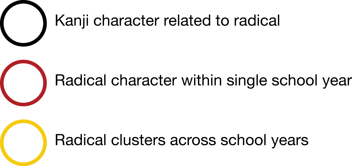 For readability, this visualization only shows 20 of the most common radicals and their kanji, and only those kanji which are taught in Japanese grades 1 through 6. In each of the sections below, a list of kanji learned by students is provided according to grade level.
