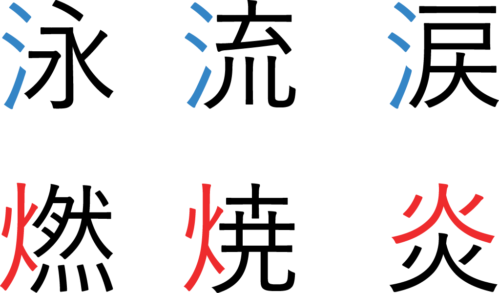 In the same way that matter is made up of atoms that combine in different ways to create our physical world, radicals are the building blocks of Japanese and Chinese characters. Radicals are ideographic subunits that carry clues about the meaning or reading of a character in the Japanese and Chinese languages; for example, one radical meaning water is often found in characters with meanings related to water, and similarly, other radicals perform the same function with meanings around earth, fire, motion and movement, parts of the human body and many others. If you can recognize the radical in a character, you can often guess its meaning or pronunciation even if you have never seen the character itself before. Below are some examples of kanji with shared radicals highlighted in blue (water) and red (fire).